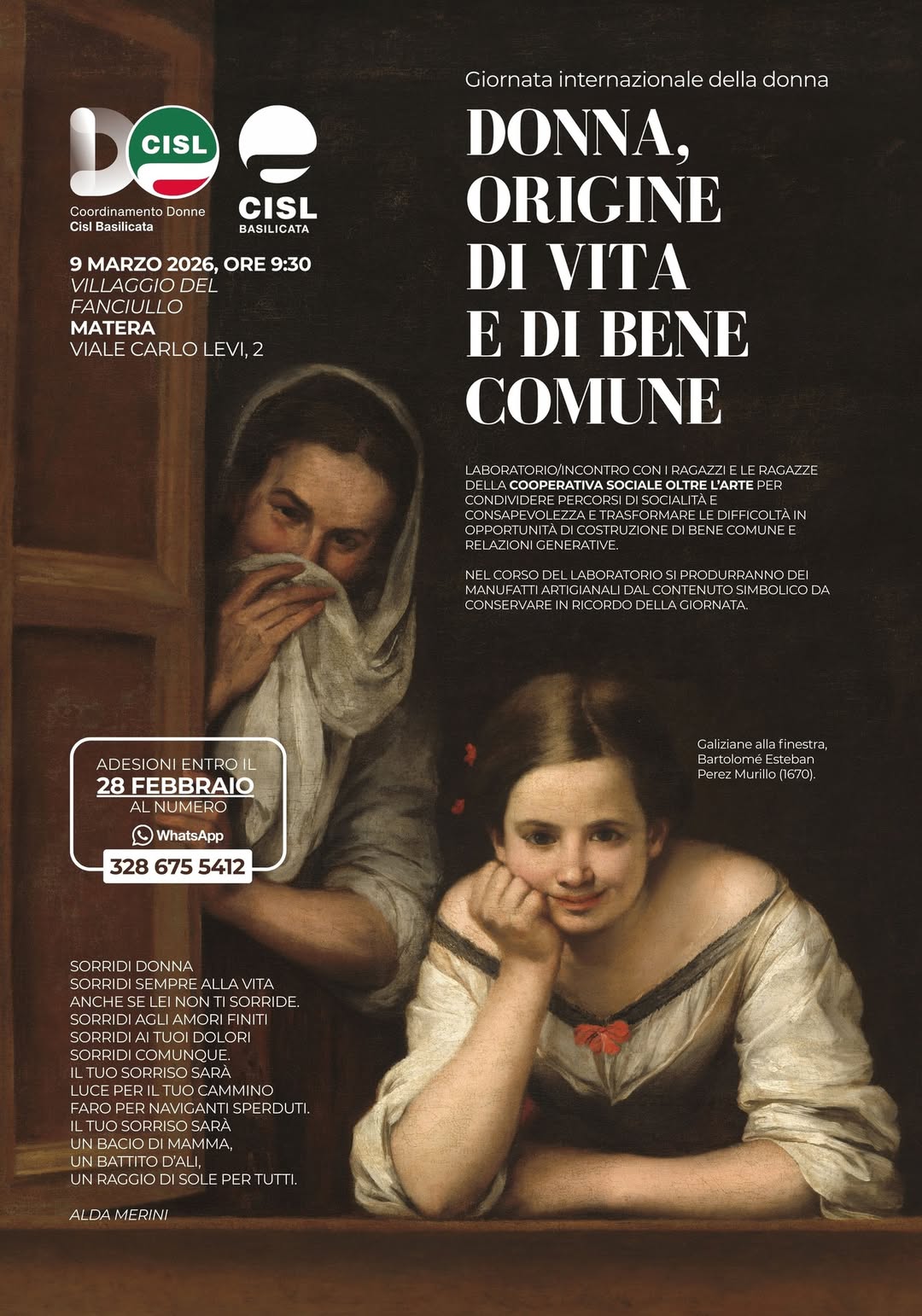 Per concludere, a Matera, lunedì 9 marzo, dalle 9:30, al Villaggio del fanciullo, in Viale Carlo Levi 2, il coordinamento donne della Cisl ha organizzato un laboratorio con i ragazzi e le ragazze della cooperativa sociale “Oltre l’arte”. «L’obiettivo – spiega la coordinatrice Margherita Dell’Otto – è condividere percorsi di socialità e consapevolezza per trasformare le difficoltà in opportunità di costruzione di bene comune e relazioni generative».