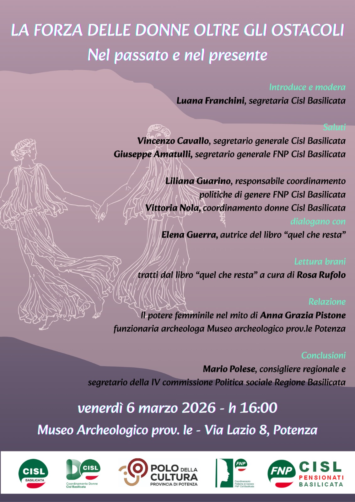 I lavori saranno introdotti e moderati dalla segretaria regionale della Cisl Luana Franchini. Due i momenti principali del pomeriggio, che saranno preceduti dai saluti dei segretari generali Vincenzo Cavallo (Cisl) e Giuseppe Amatulli (Fnp). Nel primo Liliana Guarino (responsabile del coordinamento politiche di genere della Fnp Cisl Basilicata) e Vittoria Nola (coordinamento donne della Cisl Basilicata) dialogheranno con Elena Guerra, autrice del romanzo “Quel che resta”, con la lettura di alcuni brani significativi affidata alla voce di Rosa Rufolo. Sarà poi la volta di Anna Grazia Pistone, funzionaria archeologa del Museo archeologico provinciale di Potenza, con la relazione “Il potere femminile nel mito”. A chiudere i lavori sarà Mario Polese, consigliere regionale e segretario della IV commissione Politica sociale del Consiglio regionale della Basilicata.