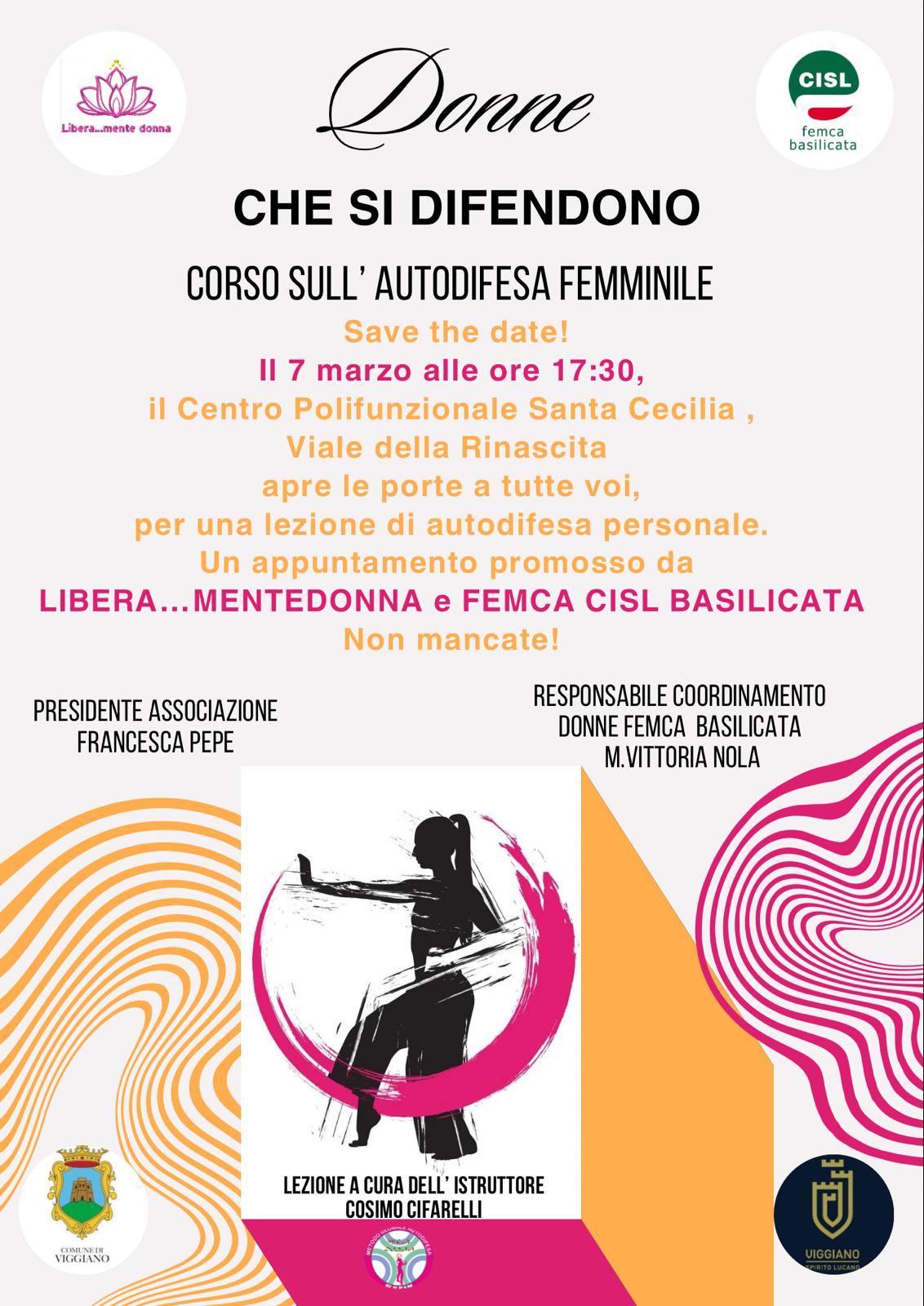Il programma di iniziative per la Giornata internazionale della donna prevede altri due appuntamenti. Il primo si terrà sabato 7 marzo, a partire dalle 17:30, al centro polifuzionale Santa Cecilia di Viggiano. Si tratta della presentazione di un corso sull’autodifesa femminile promosso dal coordinamento donne della Femca Cisl Basilicata e dall’associazione “Libera… mente donna”, con una lezione dimostrativa a cura dell’istruttore Cosimo Cifarelli. «Con questa iniziativa vogliamo evidenziare l’importanza dell’autodifesa femminile, non solo per imparare tecniche fisiche di protezione, ma soprattutto per sviluppare consapevolezza, sicurezza e autonomia», spiega la coordinatrice donne della Femca Cisl Vittoria Nola.
