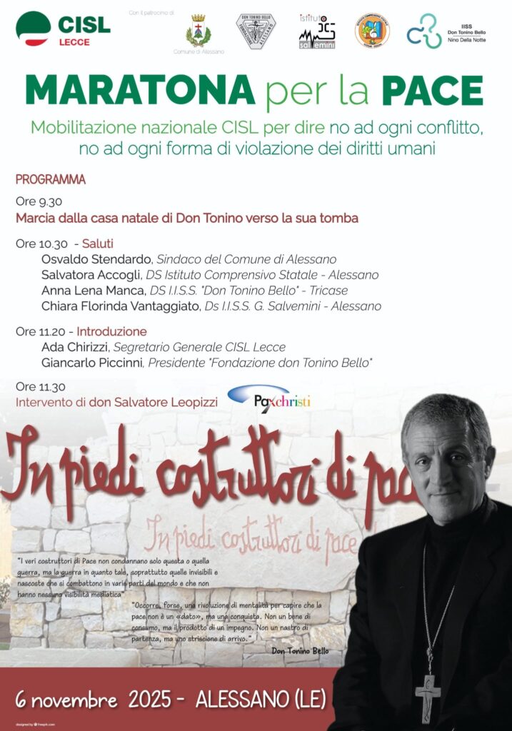 Iniziativa della Cisl di Lecce con il patrocinio dell Comune di Alessano, della Fondazione don Tonino Bello e delle Istituzioni Scolastiche del territorio ad Alessano il 6 novembre prossimo che vedrà la partecipazione degli studenti delle classi di scuola secondaria di primo e secondo grado e la testimonianza di don Salvatore Leopizzi di “Pax Christi”, compagno di viaggio di don Tonino Bello. Una Marcia della Pace che, partendo alle ore 9.30 dalla casa natìa di don Tonino Bello, condurrà alla tomba di questo grande testimone dei princìpi di fratellanza tra i popoli e rispetto della dignità umana.
