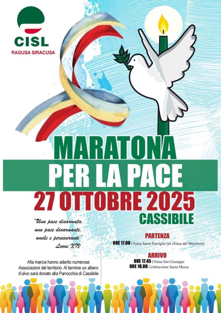 La Cisl Ragusa Siracusa il 27 Ottobre organizza una ‘Marcia per la Pace’ a Cassibile in provincia di Siracusa con partenza alle 17,00 dalla Chiesa Sacra Famiglia. Arrivo alle 17,45 presso la Chiesa San Giuseppe dove alle 18,00 verrà celebrata la Santa Messa. Numerose le Associazioni del territorio che hanno aderito all’iniziativa al termine della quale sarà donato un albero alla Parrocchia di Cassibile.