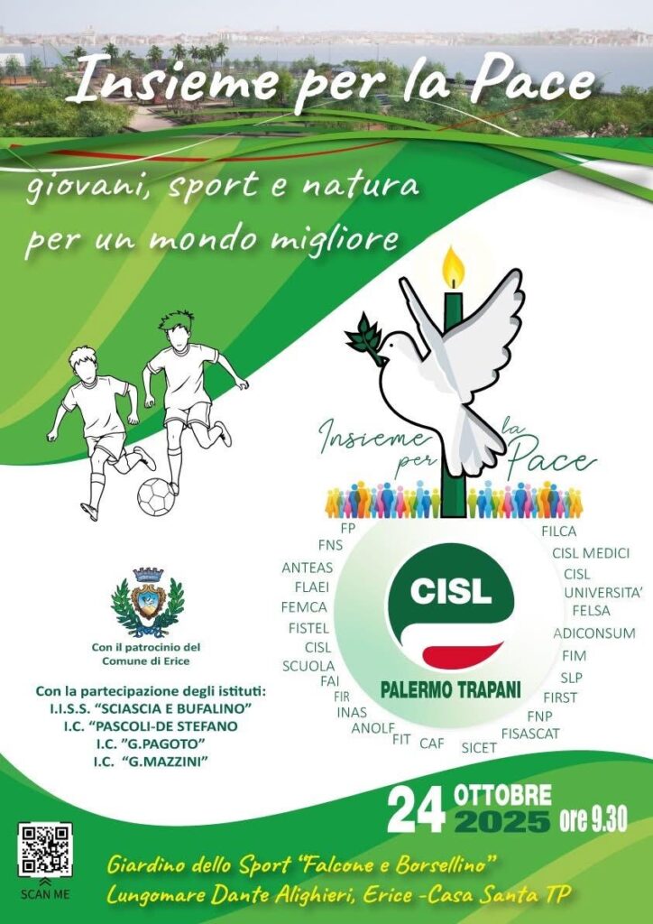 ‘Giovani, sport e natura per un mondo migliore’, con il patrocinio del Comune di Erice, il 24 ottobre alle 9,30, iniziativa della Cisl Palermo Trapani che si svolgerà al giardino dello sport ‘Falcone e Borsellino’, sul lungomare Dante Alighieri di Erice – Casa Santa (TR).