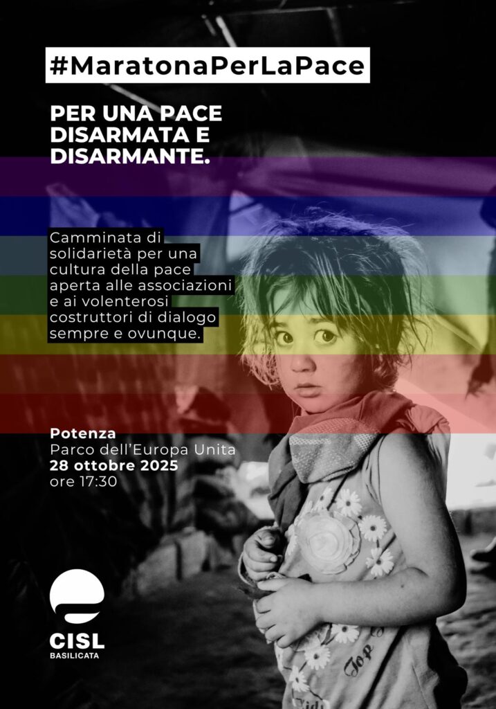 La Cisl Basilicata organizza per martedi 28 ottobre alle ore 17.30 presso il parco dell’ Europa Unita a Potenza una camminata di solidarietà per una cultura della pace aperta alle associazioni e ai volenterosi costruttori di dialogo sempre ed ovunque.