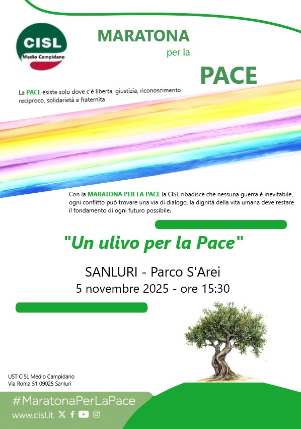 ‘Un Ulivo per la Pace’, l’iniziativa della Ust Cisl Medio Campidano che si terrà a Sanluri il 5 Novembre al Parco S’Arei, alle 15,30