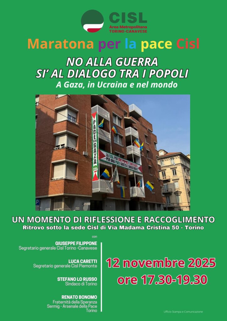 La CISL Area Metropolitana Torino-Canavese ha organizzato una fiaccolata per la pace sotto la propria sede di Via Madama Cristina 50 – Torino, Mercoledì 12 novembre 2025 dalle ore 17.30 alle ore 19.30. L’iniziativa sarà un momento di riflessione e raccoglimento per dire no alla guerra e sì al dialogo tra i popoli, a Gaza, in Ucraina e nel mondo.