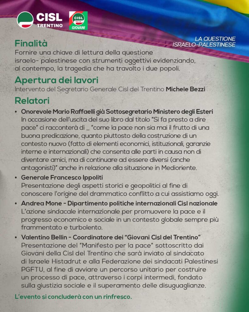 “La questione Israelo-Palestinese” ore 9.30-12.00 Sala vetrata – Cisl del Trentino, Via De Gasperi 61