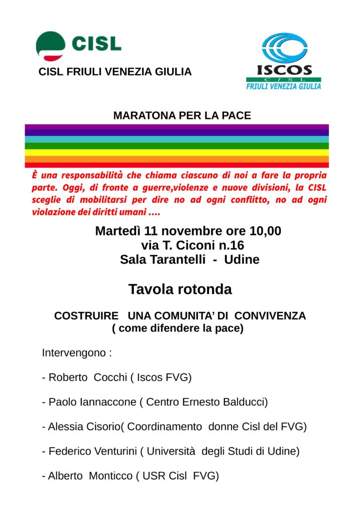 L’Iscos FVG in collaborazione  con Cisl FVG, organizza  una iniziativa  di dibattito e confronto sui processi  di convivenza nella società civile  e di difesa della pace, ora più che mai  in pericolo.