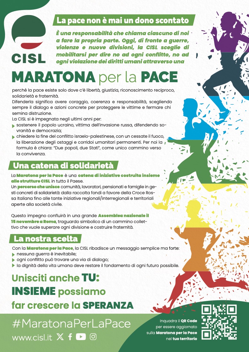 Sindacato. Cisl: “Una Maratona per la Pace per rilanciare impegno contro tutte le guerre e violazioni dei diritti umani. Assemblea Nazionale a Roma il 15 novembre”