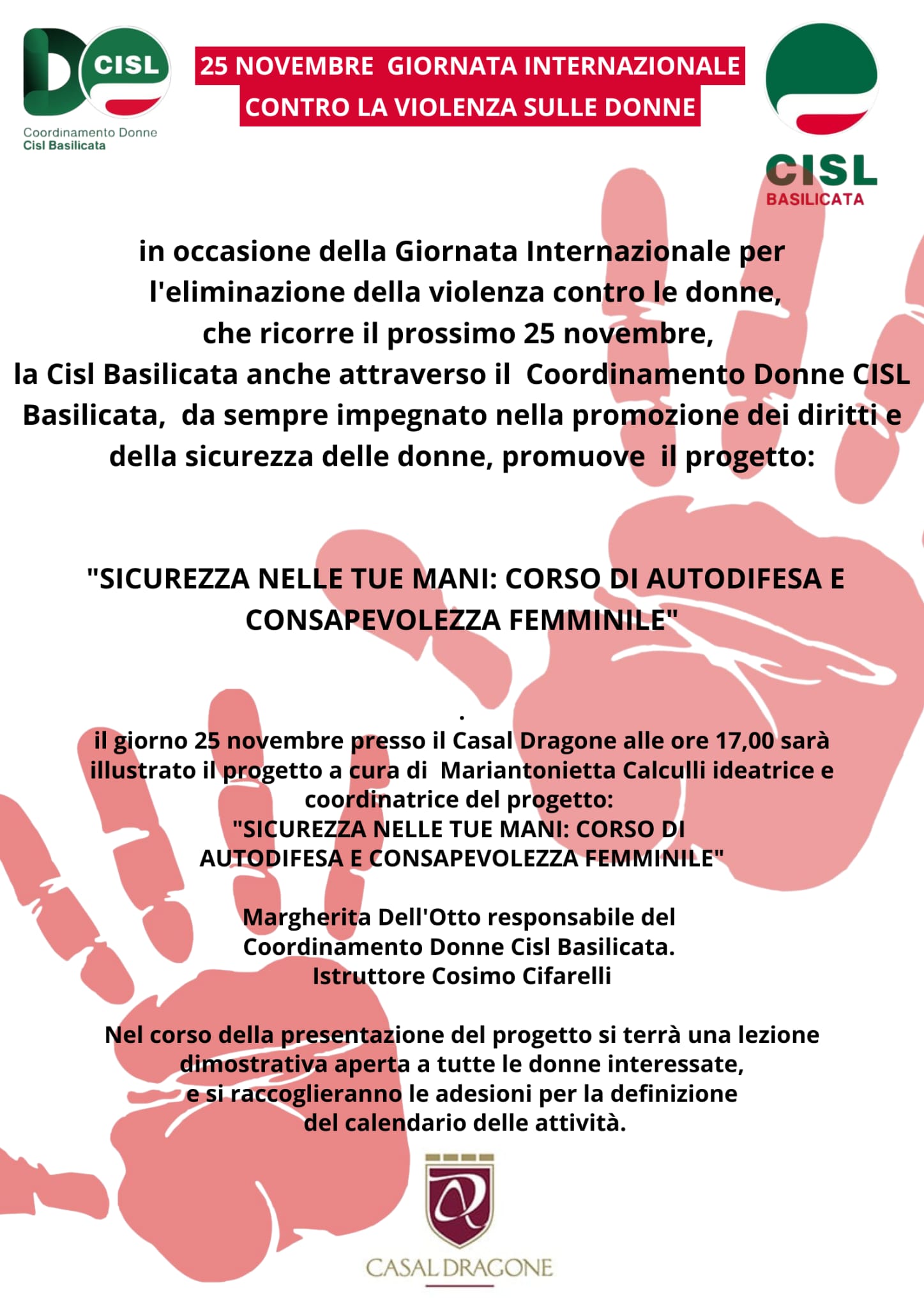 La violenza contro le donne è un problema degli uomini. È questo lo slogan scelto dalla segreteria regionale e dal coordinamento donne della Cisl Basilicata per la campagna di sensibilizzazione in occasione la Giornata internazionale per l’eliminazione della violenza contro le donne. Nel capoluogo, la segretaria regionale Luana Franchini interverrà all’iniziativa promossa dal Comune di Potenza sul tema «Il mondo salvato dai ragazzini e dalle ragazzine: una giornata con Elsa Morante nel quarantennale della sua morte». A Matera, invece, al Casal Dragone, alle 17:00, la Cisl presenta il progetto «La sicurezza nelle tue mani: corso di autodifesa e consapevolezza femminile». Interverranno la responsabile del coordinamento donne della Cisl Margherita Dell’Otto, l’ideatrice e coordinatrice del progetto Mariantonietta Calcoli e l’istruttore Cosimo Cifarelli. Nel corso della presentazione si terrà una lezione dimostrativa aperta a tutte le donne interessate e si raccoglieranno le adesioni per la definizione del calendario delle attività. «In occasione della Giornata internazionale per l’eliminazione della violenza contro le donne, il coordinamento donne della Cisl Basilicata rilancia con forza un appello che ci vede impegnati tutti i giorni in ogni contesto delle nostre attività: la violenza di genere non può e non deve essere considerata un problema solo femminile. È una responsabilità degli uomini e necessita del loro attivo coinvolgimento per essere sradicata», spiegano la segretaria regionale della Cisl Luana Franchini e la coordinatrice donne Margherita Dell’Otto.