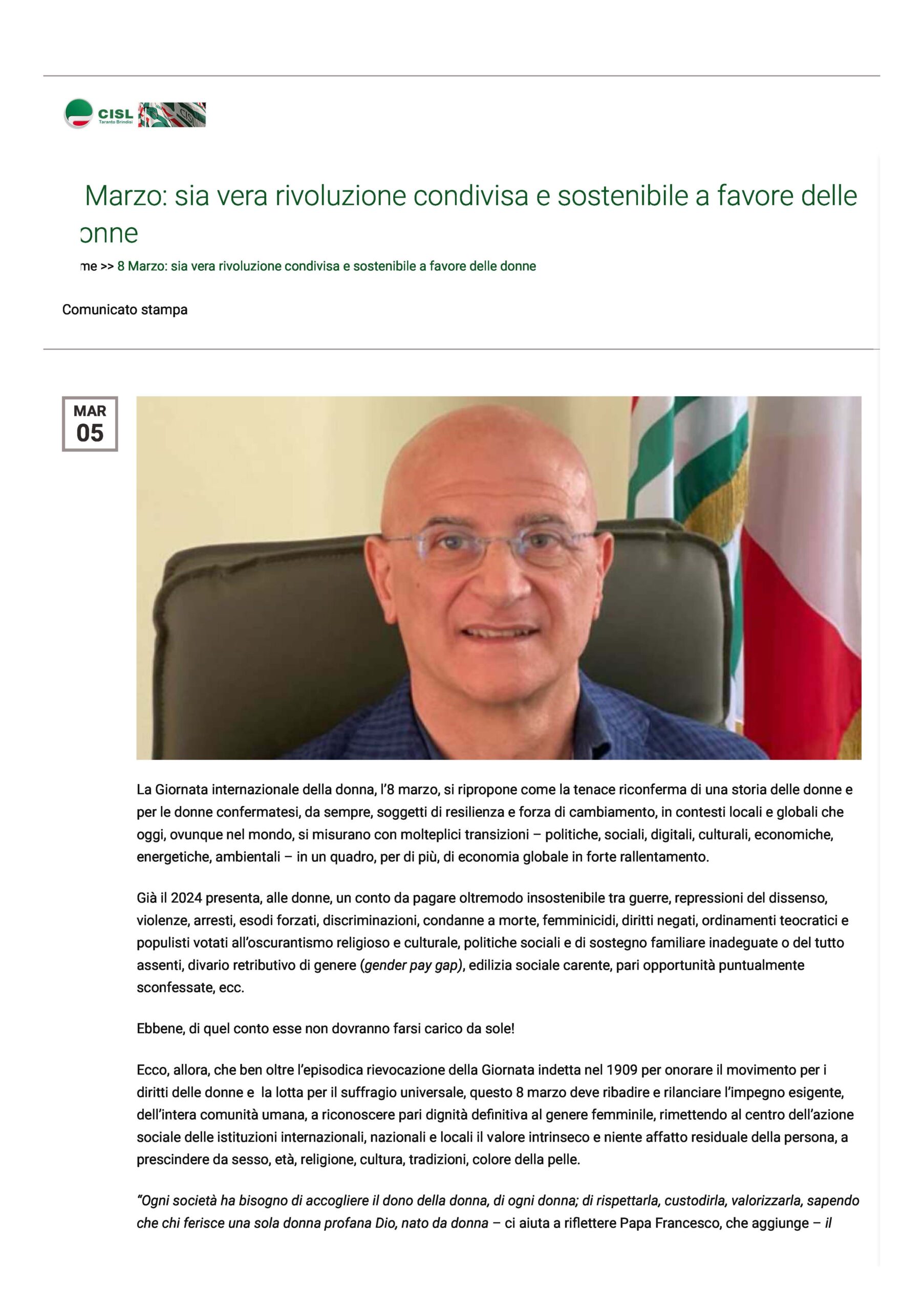 Ecco una consapevolezza che con l’8 marzo 2024 va rilanciata, condivisa ed alimentata giorno dopo giorno, oltre ogni episodicità, perché nulla si conquista una volta per sempre, tanto più che le molteplici tematiche, anche a causa di fatti di cronaca eclatanti, ci costringono ad una continua attività di vigilanza, di lotta, di rivendicazione e di promozione della cultura del rispetto e della non violenza.