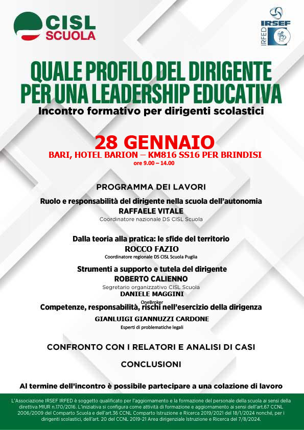 Organizzato da Cisl Scuola Puglia, con IRSEF IRFED, si terrà il 28 gennaio prossimo – dalle ore 9, presso l’Hotel Barion a Bari, al Km 816 della SS 16 per Brindisi – l’incontro formativo per i dirigenti scolastici “Quale profilo del dirigente per una leadership educativa”.