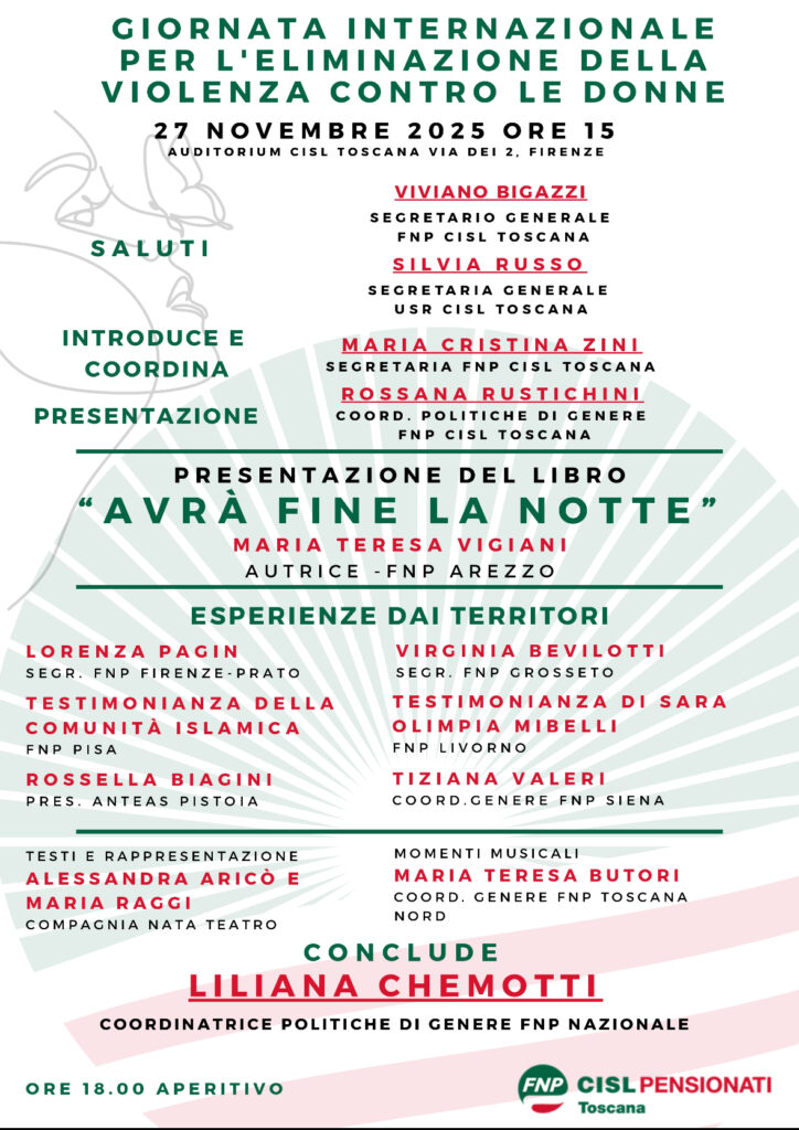 Testimonianze, esperienze, dati per fotografare la situazione oggi in Toscana, la presentazione di un libro, una rappresentazione scenica e momenti musicali. Sono gli ingredienti del pomeriggio che la Federazione Pensionati della Cisl Toscana organizza in occasione della Giornata internazionale per l’eliminazione della violenza contro le donne. L’appuntamento è per giovedì prossimo, 27 novembre, dalle ore 15, nell’Auditorium della Cisl Toscana. L’incontro sarà chiuso dall’intervento della coordinatrice politiche di genere della Fnp-Cisl nazionale, Liliana Chemotti.“Il programma -dice Maria Cristina Zini, della Segreteria Fnp-Cisl Toscana– prevede l’illustrazione di esperienze significative realizzate in tutte le province che testimoniano l’attenzione della Cisl Pensionati alla questione della violenza di genere ed ai possibili scenari per il superamento di questo fenomeno. Al centro della giornata si pone la riflessione sul testo “Avrà fine la notte”, scritto da Maria Teresa Vigiani, della Fnp-Cisl di Arezzo, che traccia una ricostruzione storica del fenomeno della violenza sulle donne e lascia però spazio alla speranza di poter concludere il cammino verso l’uguaglianza.” Un libro sulle donne, ma scritto per le donne e per gli uomini, che –come dice l’autrice- dimostra che “non siamo più sole e insieme possiamo riscrivere la storia.”