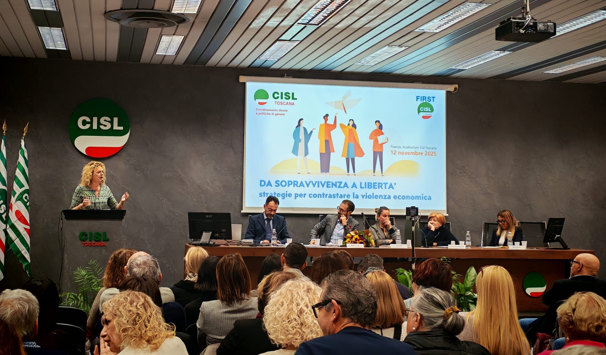 “Quella economica è una violenza che non lascia lividi sulla pelle, ma segna in profondità la libertà e la dignità delle donne.” E’ quanto affermato da Silvia Russo, segretaria generale Cisl Toscana nel suo intervento conclusivo all’iniziativa che la Cisl ha dedicato oggi proprio a questa forma spesso invisibile e silenziosa, ma terribilmente efficace, di violenza di genere.“La violenza economica – ha detto Russo – è quella che si consuma quando una donna non può disporre del proprio denaro, quando il suo stipendio le viene sottratto, quando le viene impedito di lavorare o di studiare, quando non può accedere al conto corrente di famiglia o, per farlo, deve chiedere ‘il permesso’ per ogni spesa; troppo spesso le donne restano così prigioniere di relazioni violente, perché la dipendenza economica diventa una catena invisibile, che trattiene, isola, fa paura. Una donna su tre che subiscono violenza domestica vive anche forme di violenza economica.”“La violenza economica -ha sottolineato la segretaria Cisl – non riguarda solo le mura di casa: c’è un intero sistema che continua a rendere più difficile per una donna guadagnare, lavorare, scegliere; un sistema in cui le donne guadagnano meno a parità di lavoro, hanno carriere più brevi, pensioni più basse e portano sulle spalle il peso maggiore del lavoro di cura.”“La violenza – ha poi avvertito Russo – si annida anche nei contratti precari, nei part-time involontari, nella mancanza di servizi, nelle scelte obbligate tra lavoro e maternità, insomma in quello che noi chiamiamo lavoro fragile. E allora non possiamo più considerarlo un problema privato: è una questione sociale, culturale, politica; è una questione di giustizia. Senza autonomia economica, la libertà resta un diritto solo sulla carta.”“Come Cisl – ha concluso Russo – abbiamo la responsabilità grande di promuovere il lavoro delle donne, la loro stabilità, la loro formazione; di costruire luoghi di lavoro sicuri, rispettosi, e liberi da ogni forma di discriminazione; di accompagnare le donne che subiscono violenza anche con sportelli di ascolto, tutela legale, supporto per il reinserimento lavorativo. E al tempo stesso cambiare la cultura, educando al rispetto, al valore del lavoro femminile, al diritto di ogni donna di essere padrona del proprio tempo, del proprio corpo, del proprio futuro.In vista della Giornata internazionale per l’eliminazione della violenza contro le donne del 25 novembre, la Cisl Toscana, insieme alla First (lavoratori bancari, assicurativi e riscossione tributi), ha scelto di approfondire il tema in parte sottovalutato della violenza economica. La giornata si è aperta con gli interventi di Katiuscia Biliotti, della Segreteria Cisl Toscana e di Angela Settembrini, coordinatrice donne e politiche di genere Cisl Toscana; poi una tavola rotonda con il segretario generale First-Cisl Toscana Marco Lenzini, la Consigliera di parità della Regione Toscana Maria Grazia Maestrelli, la psicologa e psicoterapeuta Tania Berti dell’Associazione Artemisia, l’avvocata Silvia Muratori. Prima della relazione conclusiva di Silvia Russo, i partecipanti hanno assistito allo spettacolo teatrale “Femminile. La donna nella letteratura e nella musica” di Fabio Cicaloni.I dati illustrati dai relatori confermano che c’è ancora strada da fare per la piena parità di genere: in Toscana, nel settore privato, gli uomini percepiscono in media un compenso giornaliero lordo di 100,9 euro, contro i 76 euro delle donne; nella nostra regione il tasso di occupazione femminile (al 30 giugnoscorso) è del 65,9% rispetto al 77,4% di quella maschile: un dato migliore di quello nazionale (rispettivamente 53,9% e 71,4%) ma ancora lontano dalla parità. A rendere insufficienti i redditi femminili è anche il ricorso al part-time, spesso imposto dalle aziende o dalle situazioni familiari: i tre quarti di tutti i contratti part time in Toscana (302mila) sono femminili (226mila, il 74,5%), sebbene le donne siano solo il 44,6% (744mila) di tutti gli occupati (1,668 milioni) nella regione. E anche sul fronte delle competenze finanziarie le donne sono in svantaggio: un’indagine Bankitalia del 2023 assegna agli uomini un punteggio medio (tra 0 e 20) di 10,9 e alle donne di 10,5.
