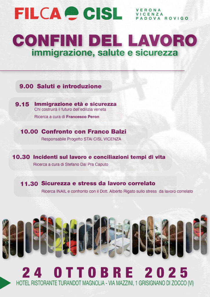 E proprio da questa riflessione nasce il convegno “Confini del lavoro. Immigrazione, salute e sicurezza” che si terrà venerdì 24 ottobre a partire dalle 9.00 all’Hotel Turandot Magnolia di via Mazzini a Grisignano di Zocco (Vicenza). Un’iniziativa che si svolgerà nell’ambito dei Consigli generali riuniti di Filca Padova-Rovigo, Vicenza e Verona – con la presenza dei rispettivi segretari generali (Rosolino Coniglio, Lorenzo D’Amico e Michela Benati). Nel corso dell’evento, che nei prossimi mesi sarà riproposto nelle province di Belluno, Treviso e Venezia, sarà presentata dalla Fondazione Corazzin la ricerca “Immigrazione, età e sicurezza. Chi costruirà il futuro dell’edilizia veneta?”, si svolgerà un confronto con Franco Balzi, responsabile del progetto STAi (Sinergie Territoriali di Accompagnamento all’Inclusione) promosso dalla Cisl Vicenza e sarà infine illustrato il rapporto finale della Ricerca sullo stress lavoro correlato nell’edilizia veneta elaborata dallo psicologo Alberto Rigato nell’ambito di un progetto che ha visto la collaborazione delle Scuole Edili delle province del Veneto, in particolare il Centro per la Formazione e Sicurezza di Belluno, capofila del progetto e destinatario dei Fondi erogati da INAIL – Direzione Regionale Veneto.
