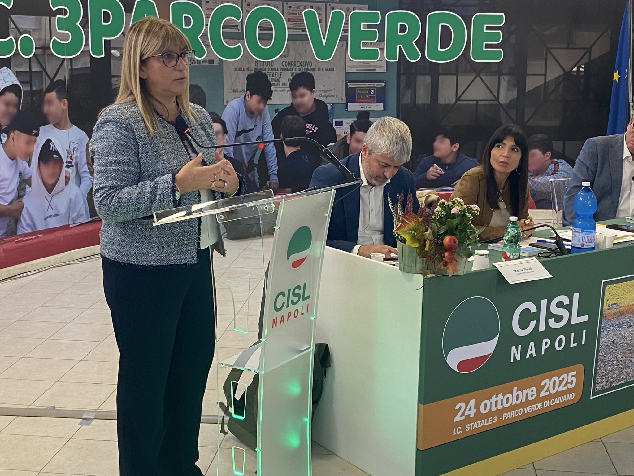 “Qui, a Caivano, la Cisl ha dimostato in questi dodici mesi cosa significa essere un sindacato capace di farsi parte attiva del cambiamento, di stare dentro ai processi di crescita non solo culturale, ma anche etica e morale , delle nuove generazioni. Un impegno di prossimità e solidarietà tanto più forte quanto maggiori sono gli ostacoli e le resistenze che vi trovate ad affrontare. Per questo, un ringraziamento particolare voglio rivolgerlo a tutti gli insegnanti, al personale amministrativo, tecnico e ausiliario, che con il loro lavoro – mai adeguatamente valorizzato e riconosciuto – contribuiscono alla formazione delle donne e degli uomini di domani. L’ Istituto Comprensivo Statale “Parco Verde”, per noi rappresenta il simbolo di un’autentica resistenza civile, come in tante altre periferie degradate del nostro Paese. Seguendo l’esempio di passione e determinazione di don Maurizio Patriciello, al quale rinnovo la solidarietà di tutta la Cisl per l’ennesima vile minaccia di cui è stato oggetto. Don Patriciello è un uomo che incarna, nella lotta alla criminalità e alla sopraffazione, l’impegno per la giustizia sociale e il bene comune.