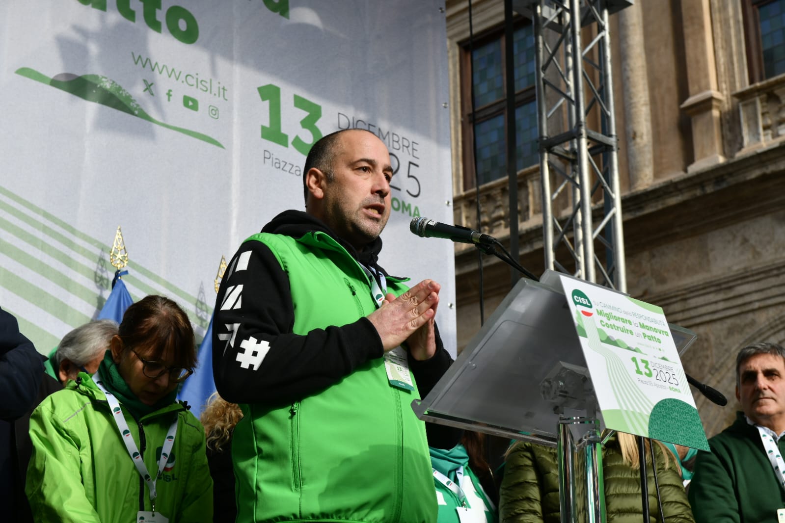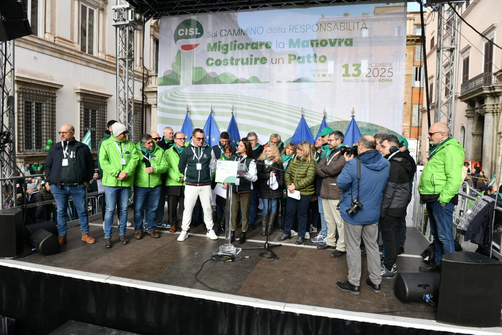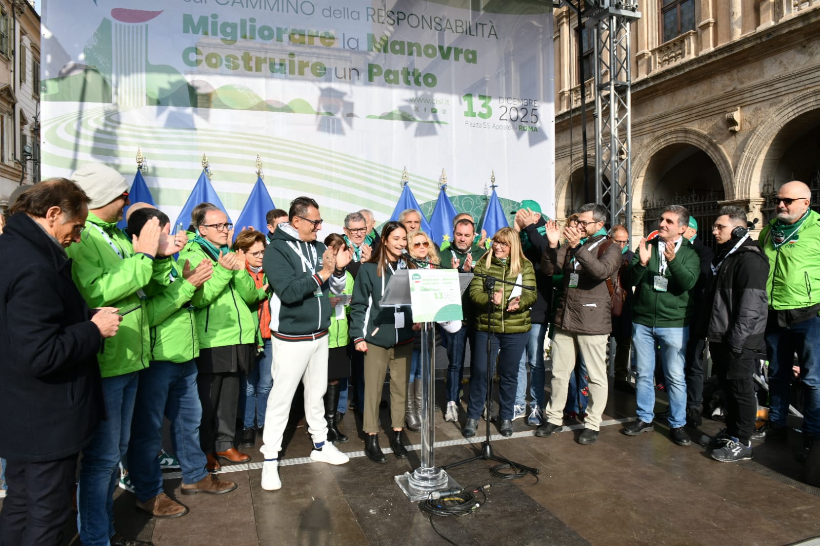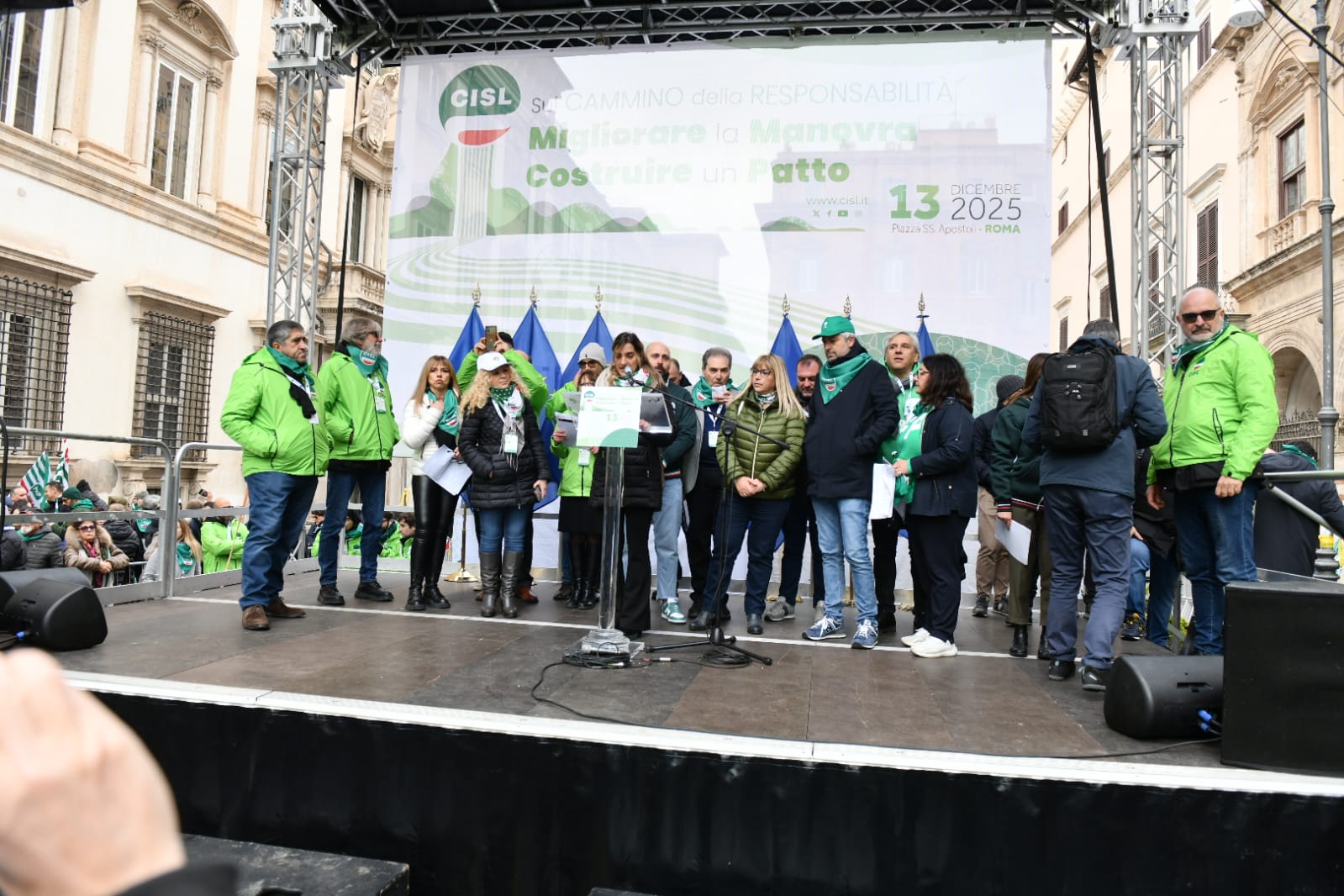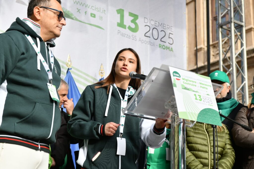 “Guardate questa piazza, guardatela davvero, guardate! Questa è la CISL. Siete voi. Sono le vostre storie, la fatica e la dignità di milioni di lavoratrici e lavoratori, di pensionati e pensionate, di giovani che non si arrendono. Siamo qui perché vogliamo cambiare il domani, non subirlo. Siamo qui non per una semplice testimonianza, ma per orgoglio. Perché la CISL c’è, perché c’è sempre stata, c’è oggi e ci sarà domani”. Con queste parole Daniela Fumarola, dopo gli interventi delle delegte e dei delegati delle federazioni e dei territori della Cisl, ha concluso la Manifestazione nazionale Migliorare la manovra, costruire un Patto che ha avuto luogo oggi, sabato 13 dicembre a Roma, in Piazza Santi Apostoli. Manifestazione che si pone all’interno del “Cammino della Responsabilità“, la campagna di mobilitazione con cui la Confederazione di via Po ha attraversato in queste settimane tutto il Paese per sostenere le richieste di modifica alla legge di bilancio e rilanciare il “patto sociale” su lavoro, crescita, coesione.