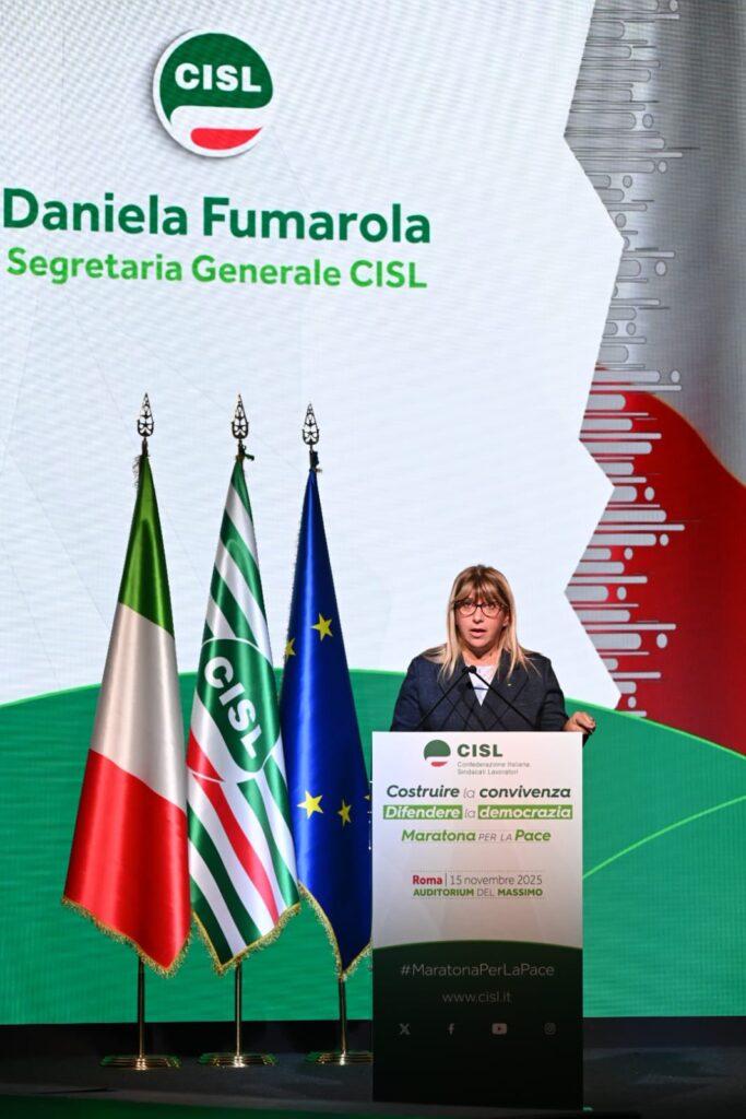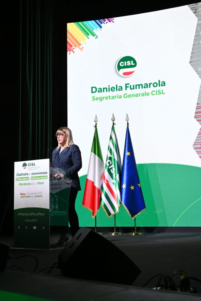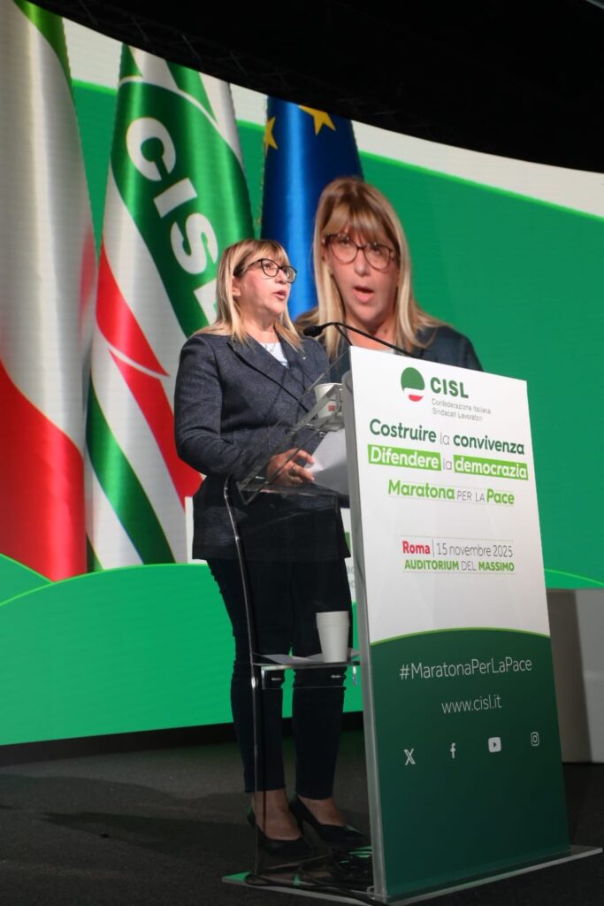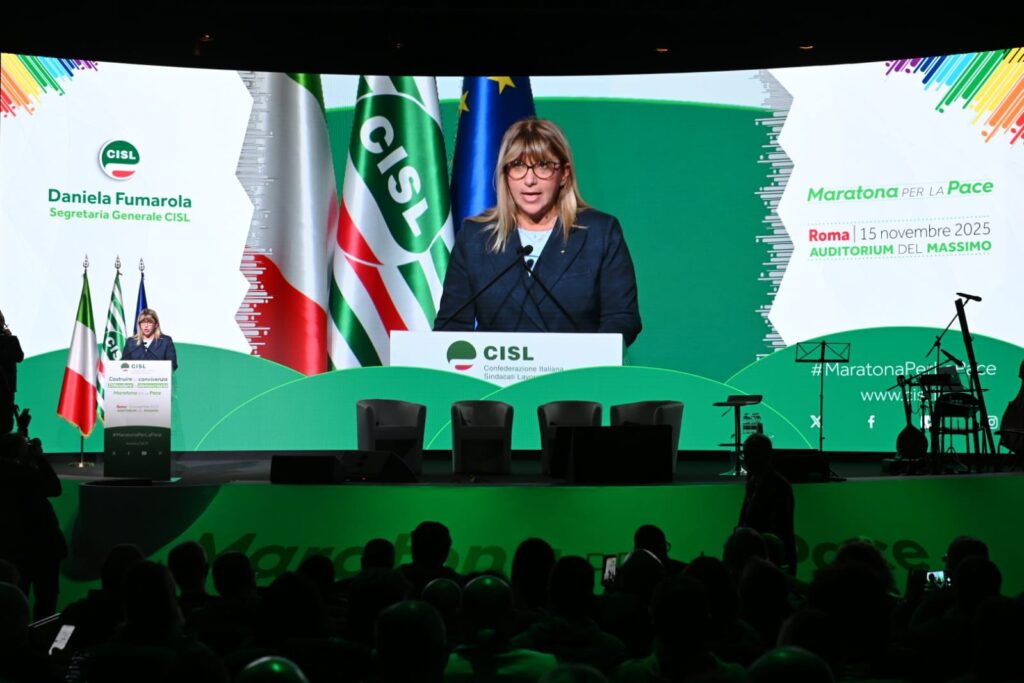 “Grazie, grazie di cuore a tutti per essere qui. Grazie alle tante persone che hanno preso parola qui in presenza, o a distanza. Grazie a tutti coloro che sono intervenuti. Al ministro Tajani, all’onorevole Gori, che hanno espresso posizioni credo molto interessanti e convergenti sullo scenario geostrategico attuale. Vuol dire che una sintonia su temi tanto importanti non solo è possibile, ma è già in essere. E aspetta solo di dare frutti politici concreti. Grazie a Padre Albanese per la sua straordinaria analisi. Una testimonianza altissima che ci ricorda quanto il lavoro quotidiano dei missionari comboniani e della cooperazione sia fondamentale, e spesso riempia il vuoto lasciato dalle istituzioni, nazionali e internazionali. Permettetemi però di esprimere una riconoscenza speciale da parte di tutta la Cisl, alle donne che abbiamo avuto l’onore e il privilegio di coinvolgere, tra cui, tre premi nobel per la Pace e una leader in esilio”. L’intervento di Daniela Fumarola all’Assemblea Nazionale della Cisl che conclude le iniziative della “Maratona per la Pace si apre con un ringraziamento che non è mera formalità ed insiste sulle donne presenti – tre Nobel per la Pace, una leader in esilio – riconoscendole come testimoni esemplari di libertà. “Donne forti, coraggiose, che hanno consacrato la propria vita alla causa della libertà. Formidabili protagoniste di battaglie e di un impegno che sono – o dovrebbero essere – un monito e una guida per tutti i governanti. Di certo lo sono per noi. I loro racconti, la loro tenacia, illumineranno la nostra strada, rimarranno scolpiti nella nostra memoria. Non per mero archivio. Ma per darci la forza di continuare un cammino che non ha, e non può avere termine. Il cammino di una Pace che si conquista e si difende ogni giorno, nella vita di ognuno, di ogni persona, di ogni comunità. E ovviamente di una grande organizzazione come la Cisl.