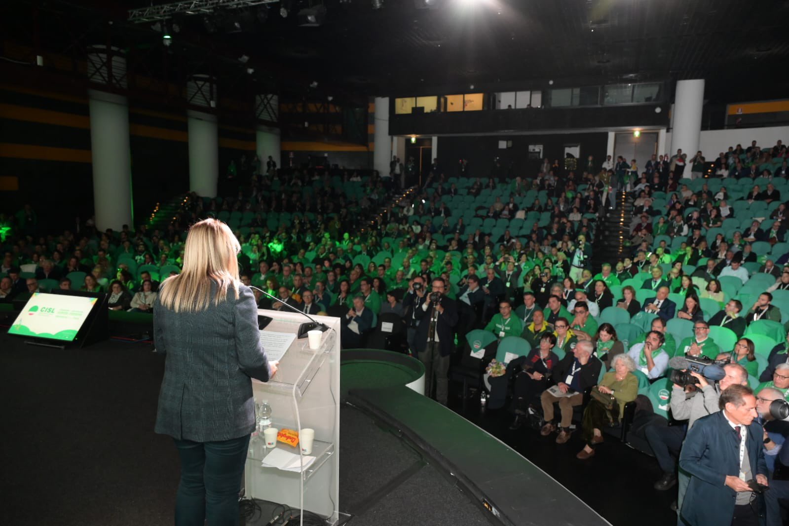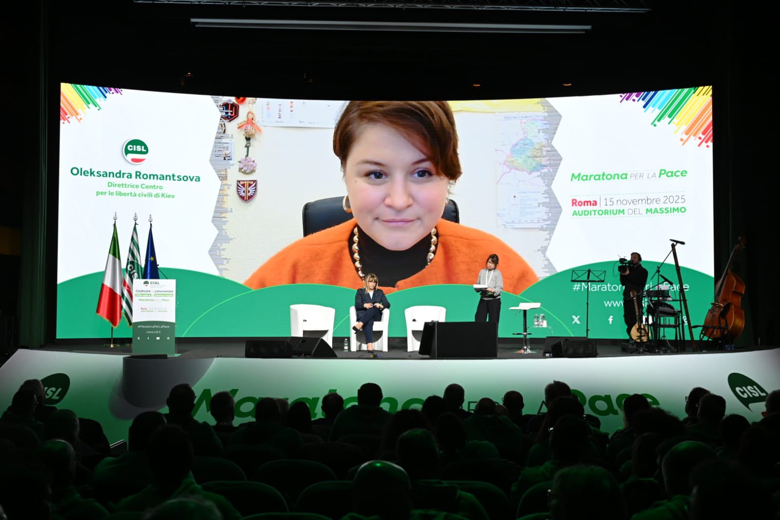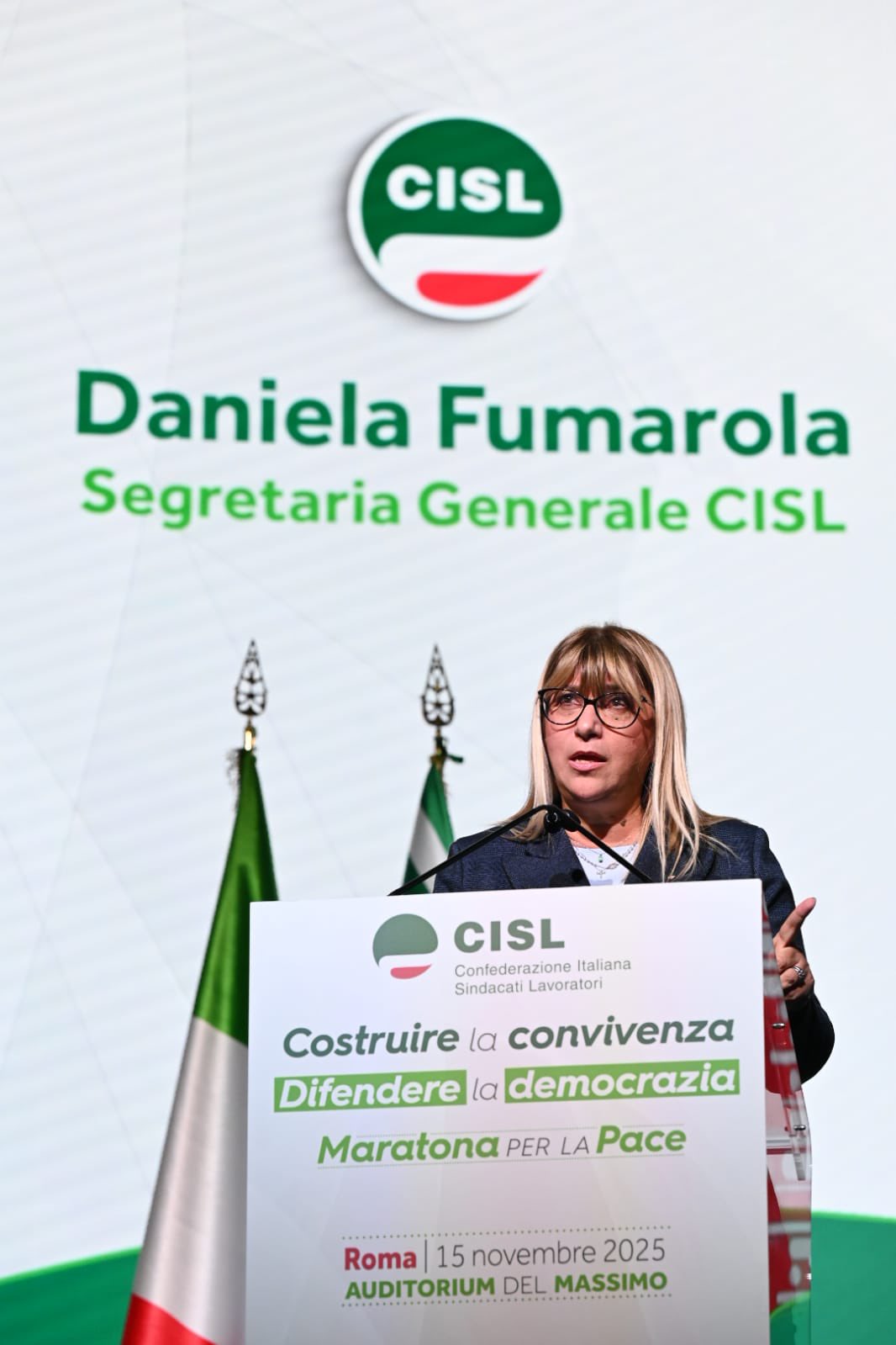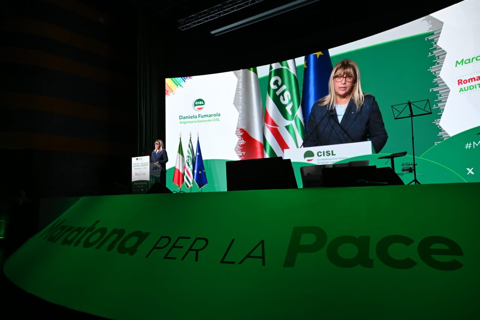 “Grazie, grazie di cuore a tutti per essere qui. Grazie alle tante persone che hanno preso parola qui in presenza, o a distanza. Grazie a tutti coloro che sono intervenuti. Al ministro Tajani, all’onorevole Gori, che hanno espresso posizioni credo molto interessanti e convergenti sullo scenario geostrategico attuale. Vuol dire che una sintonia su temi tanto importanti non solo è possibile, ma è già in essere. E aspetta solo di dare frutti politici concreti. Grazie a Padre Albanese per la sua straordinaria analisi. Una testimonianza altissima che ci ricorda quanto il lavoro quotidiano dei missionari comboniani e della cooperazione sia fondamentale, e spesso riempia il vuoto lasciato dalle istituzioni, nazionali e internazionali. Permettetemi però di esprimere una riconoscenza speciale da parte di tutta la Cisl, alle donne che abbiamo avuto l’onore e il privilegio di coinvolgere, tra cui, tre premi nobel per la Pace e una leader in esilio”. L’intervento di Daniela Fumarola all’Assemblea Nazionale della Cisl che conclude le iniziative della “Maratona per la Pace si apre con un ringraziamento che non è mera formalità ed insiste sulle donne presenti – tre Nobel per la Pace, una leader in esilio – riconoscendole come testimoni esemplari di libertà. “Donne forti, coraggiose, che hanno consacrato la propria vita alla causa della libertà. Formidabili protagoniste di battaglie e di un impegno che sono – o dovrebbero essere – un monito e una guida per tutti i governanti. Di certo lo sono per noi. I loro racconti, la loro tenacia, illumineranno la nostra strada, rimarranno scolpiti nella nostra memoria. Non per mero archivio. Ma per darci la forza di continuare un cammino che non ha, e non può avere termine. Il cammino di una Pace che si conquista e si difende ogni giorno, nella vita di ognuno, di ogni persona, di ogni comunità. E ovviamente di una grande organizzazione come la Cisl.