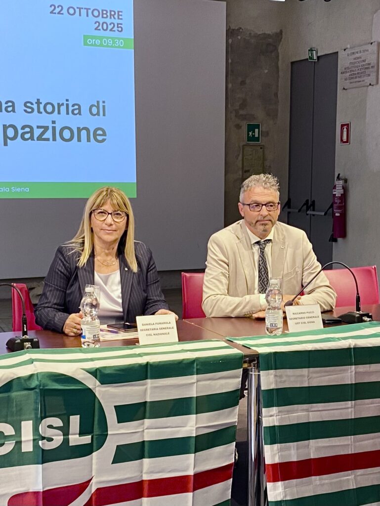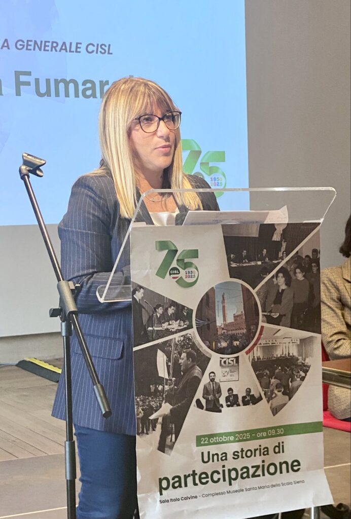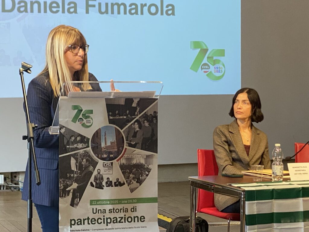 “La Cisl è una storia di partecipazione. Noi non cavalchiamo le emozioni: le traduciamo in impegno. Anche questo è il senso della nostra Maratona per la Pace”, la raccolta fondi, le tante iniziative in corso nei territori per costruire solidarietà e cultura del confronto in un mondo che attualmente conta più di 50 conflitti armati in corso. Una campagna per incontrare associazioni, società civile, giovani, cittadini che rifiutano la normalizzazione della guerra. Aiutandoli a distinguere tra aggressori e aggrediti, tra verità e propaganda, sapendo che gli avanzamenti sociali, richiedono fiato lungo e tempra solida non fiammate e reazioni istintuali. E questo vale tanto per la costruzione di un’autentica cultura della pace, quanto per la definizione di un quadro di sviluppo equilibrato e condiviso”, ha aggiunto Fumarola ringraziando la Cisl di Siena “per l’invito a condividere questa giornata importante, per la qualità degli interventi, delle testimonianze e il filo ideale che l’ha animata: ripercorrere un cammino, lungo 75 anni, di una grande storia sindacale fatta di rivendicazioni, battaglie, conquiste, traguardi, collegandolo alle aspettative, ai progetti, alle ambizioni di un’organizzazione che guarda al futuro con i piedi ben piantati nel presente, partecipe dei processi sociali e delle dinamiche economiche di tutte le comunità in cui opera”, ha sottolineato la leader Cisl Daniela Fumarola.