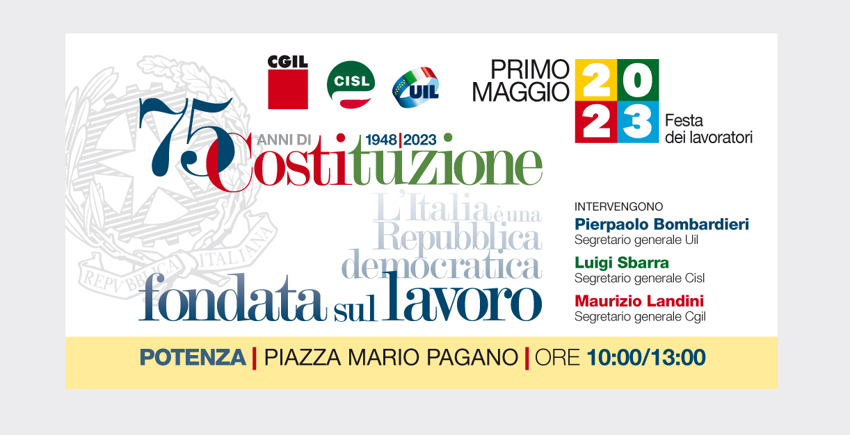 L’edizione del Primo Maggio 2023, promossa da Cgil, Cisl, Uil, è dedicata alla Carta Costituzionale, in occasione dei 75 anni dalla sua entrata in vigore. E’ la città di Potenza che ospiterà domani la tradizionale manifestazione che prenderà il via a partire dalle ore 10 in piazza Mario Pagano. Sul palco, dopo gli interventi delle lavoratrici e dei lavoratori, prenderanno la parola i tre segretari generali: alle ore 12.10 Pier Paolo Bombardieri, a seguire Luigi Sbarra e Maurizio Landini.