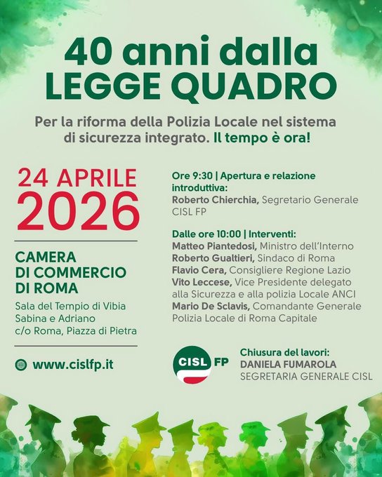 Domani 24 aprile la segretaria generale della Cisl, Daniela Fumarola, concluderà a Roma il Convegno della Fp Cisl nazionale a “40 anni dalla LEGGE QUADRO. Per la riforma della Polizia Locale nel sistema di sicurezza integrato”.