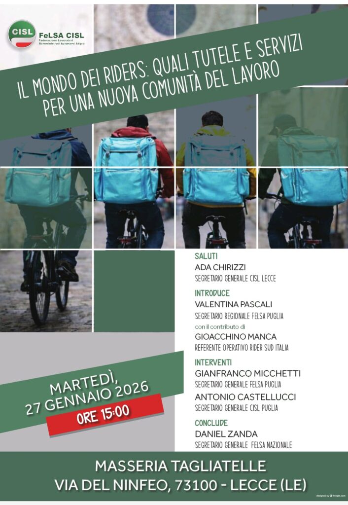 Costruire una “nuova comunità del lavoro” partendo dall’ascolto diretto di chi, ogni giorno, percorre le strade della città per garantire il servizio di consegna a domicilio. È questo l’obiettivo del convegno “Il mondo dei riders: quali tutele e servizi per una nuova comunità del lavoro“, organizzato da FeLSA CISL PUGLIA, che si terrà domani, martedì 27 gennaio 2026, alle ore 15:00, presso la Masseria Tagliatelle (Via del Ninfeo, Lecce). L’evento non sarà solo un momento di analisi teorica, ma un vero e proprio tavolo di confronto operativo. Al centro del dibattito verranno presentati i risultati di un focus group e di uno studio mirato che ha coinvolto 72 rider operanti a Lecce. Dall’indagine emergono con chiarezza le reali priorità della categoria: non solo una maggiore sicurezza stradale, ma una richiesta strutturata di servizi dedicati, tutele contrattuali più solide e misure di welfare che possano integrare e proteggere una professione troppo spesso caratterizzata da precarietà e isolamento.