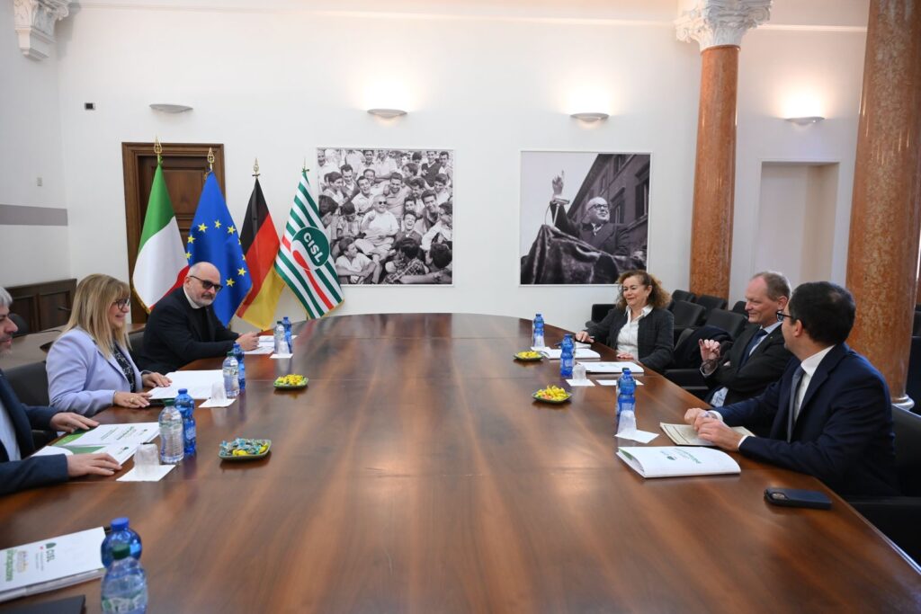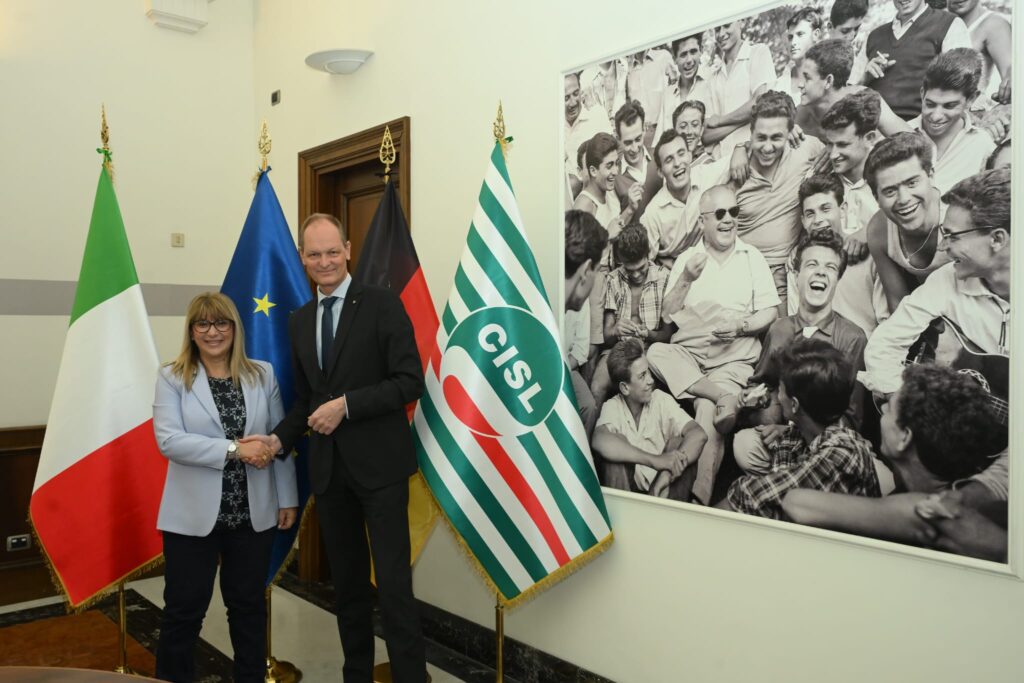 La Segretaria Generale della Cisl Daniela Fumarola ha incontrato oggi a Roma presso la sede nazionale della Confederazione il nuovo ambasciatore della Repubblica Federale di Germania in Italia, Thomas Bagger. << Italia e Germania condividono un rapporto solido, fatto di legami storici, economici, politici e sindacali- ha sottolineato nel corso dell’incontro la leader Cisl- Un rapporto che in questa fase è ancora più prezioso, perché può e deve contribuire a rafforzare il progetto europeo, rendendolo più coeso, più autonomo, più capace di agire. È importante che questo cammino sia orientato a una visione di sostenibilità integrale, capace di tenere insieme sviluppo industriale, qualità e stabilità del lavoro, partecipazione, coesione sociale e responsabilità ambientale. Viviamo una fase in cui la stabilità, la pace, la stessa idea di democrazia liberale sono messe sotto attacco. Non possiamo più darle per scontate e dobbiamo imparare a difenderle. L’Europa deve ritrovarsi unita sotto il profilo politico, sociale, economico e anche militare, con una difesa comune che sia propedeutica a una vera politica estera unitaria>> ha aggiunto la Segretaria Generale della Cisl.