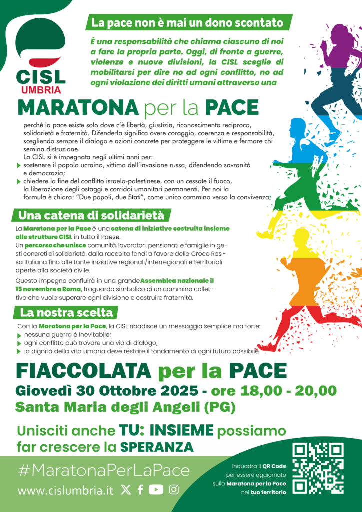 Fiaccolata per la Pace organizzata dalla Cisl Umbria che si terrà a Santa Maria degli Angeli (PG), il 30 Settembre dalle 18,00 alle 20,00