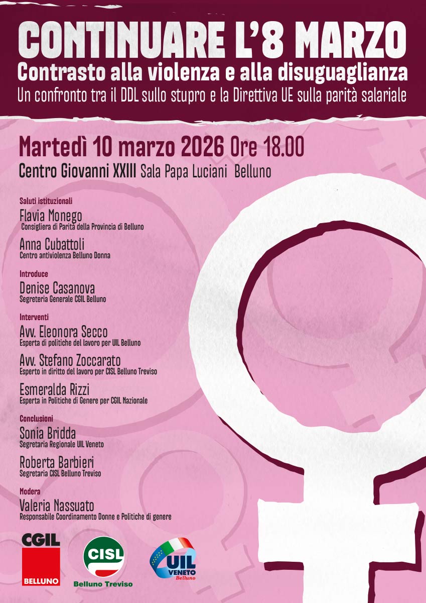 In occasione della Giornata internazionale della Donna, Cgil Belluno, Cisl Belluno Treviso con il proprio Coordinamento Donne e Politiche di Genere, e Uil Veneto Belluno, organizzano un convegno unitario dedicato a due temi di forte attualità e rilevanza sociale: il disegno di legge che dovrebbe riformare l’articolo 609 bis del codice penale sulla violenza sessuale e la direttiva europea sulla parità salariale.